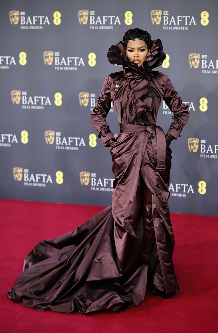Teyana apostó por un vestido-abrigo Burberry de satén en tono borgoña profundo. La silueta fue ajustada en el torso y cadera, pero explotó en volumen a través de un cuello sobredimensionado, casi isabelino, compuesto por pliegues estructurados que enmarcaron su rostro con mucha teatralidad. La falda presentó una abertura frontal estratégica que le permitió movimiento y dejó ver el calzado, mientras que la cola posterior extendió la figura con un efecto majestuoso.