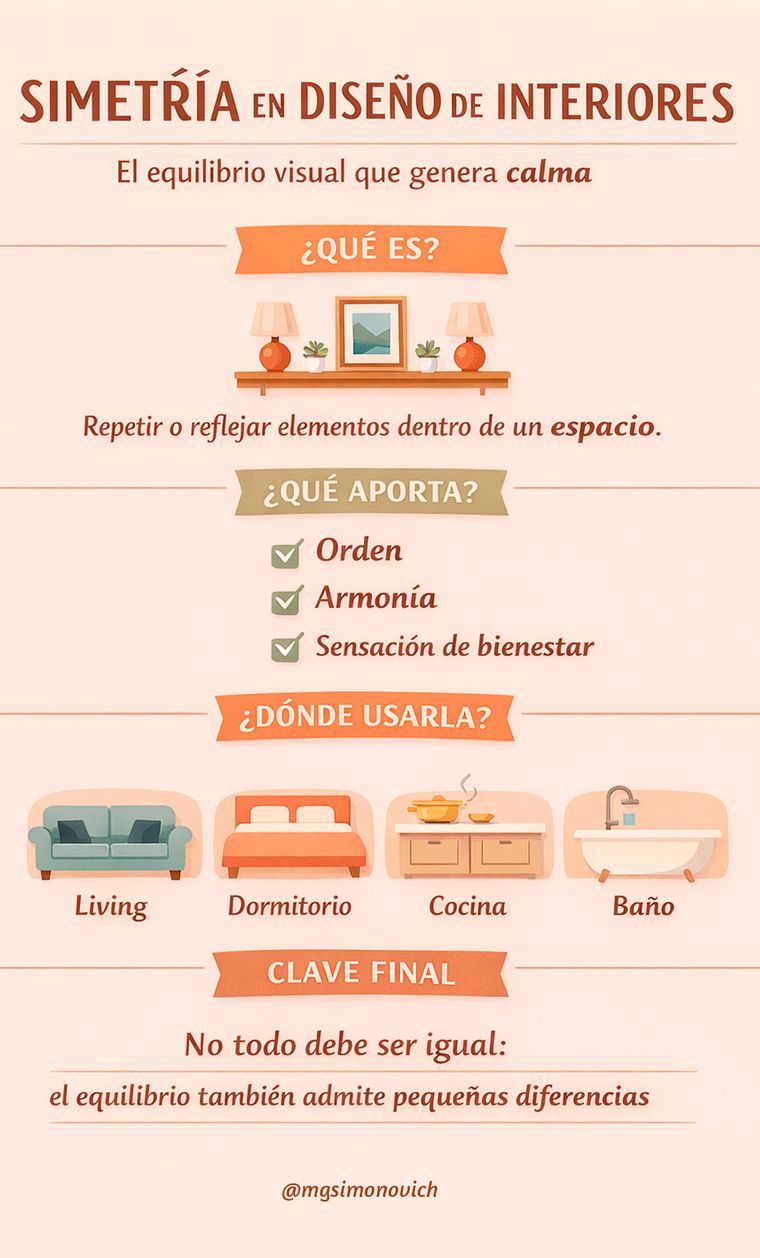 En un living o comedor de diario, por ejemplo, la simetría contribuye a que un sillón centrado, mesas gemelas o iluminación pareja permitan que el ambiente se vea pensado y coherente.
