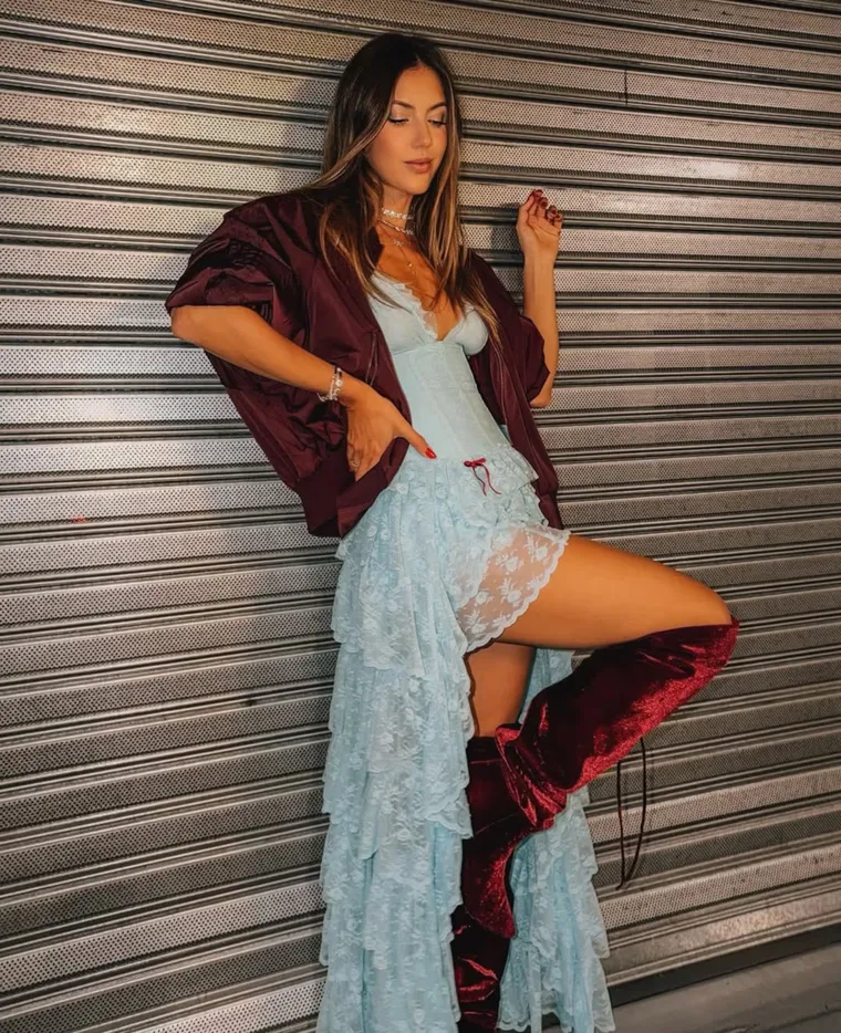 Lució un vestido de encaje celeste, diseñado por Dress & Cats, que fue el corazón del estilismo. Confeccionado a partir de textiles vintage, la pieza llevaba un fuerte componente artesanal que se traducía en capas y volumen. Su diseño era corto adelante y largo atrás, lo que generó una silueta dinámica.