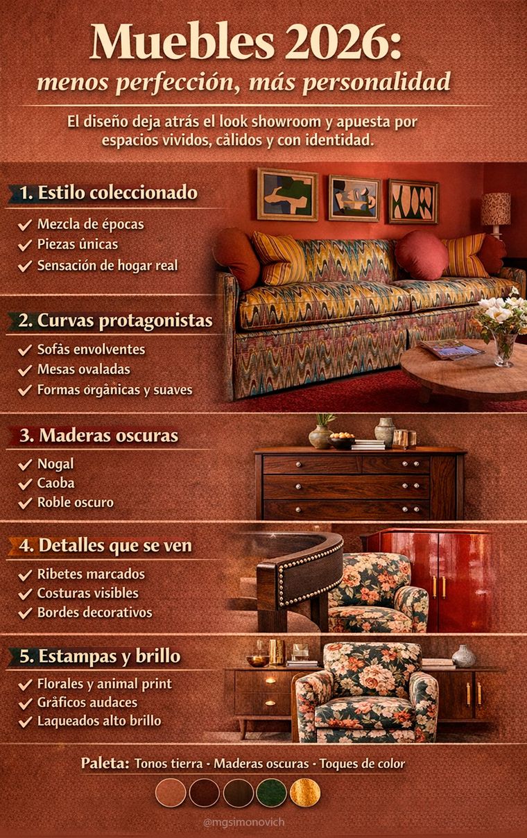El diseño de interiores cambia en 2026: los muebles dejan de ser perfectos y apuestan por curvas, maderas oscuras y estilo con personalidad.