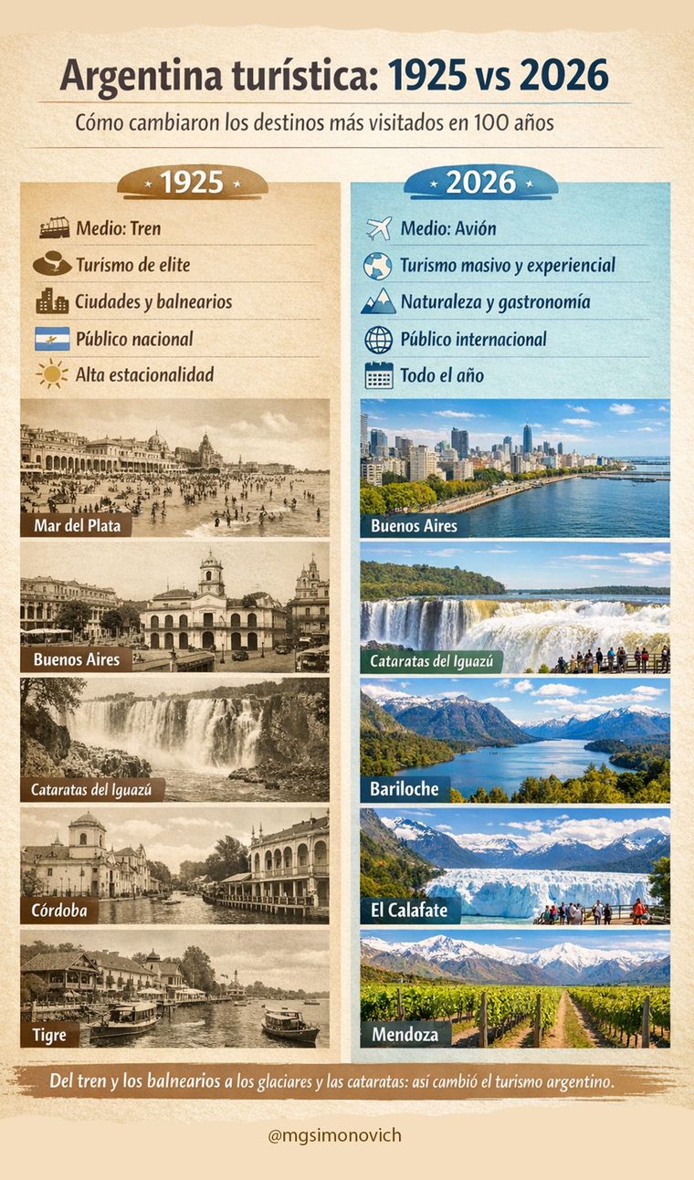 Un siglo de viajes: los cinco destinos que marcaron a la Argentina hace 100 años, en 1926, vs los lugares que más turistas se espera para 2026.