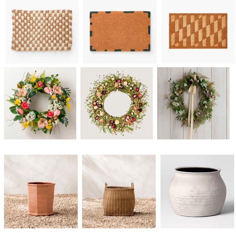 La primera fila son las esterillas o felpudos: el primero es de yute con cuadros, el segundo es un modelo que presenta bordes discontinuos y el siguiente es de fibra de coco natural. En la segunda fila hay una corona de primavera en flor, corona de flores secas y mixtas de lino sintético, y una corona artificial con colores verde, rosa suave y púrpura primaveral. Y las primeras dos de la tercer fila son cestas para macetas (una de terracota y la otra es una canasta tejida para maceta. Y cierra la fila una maceta de color neutro para interiores y exteriores.
