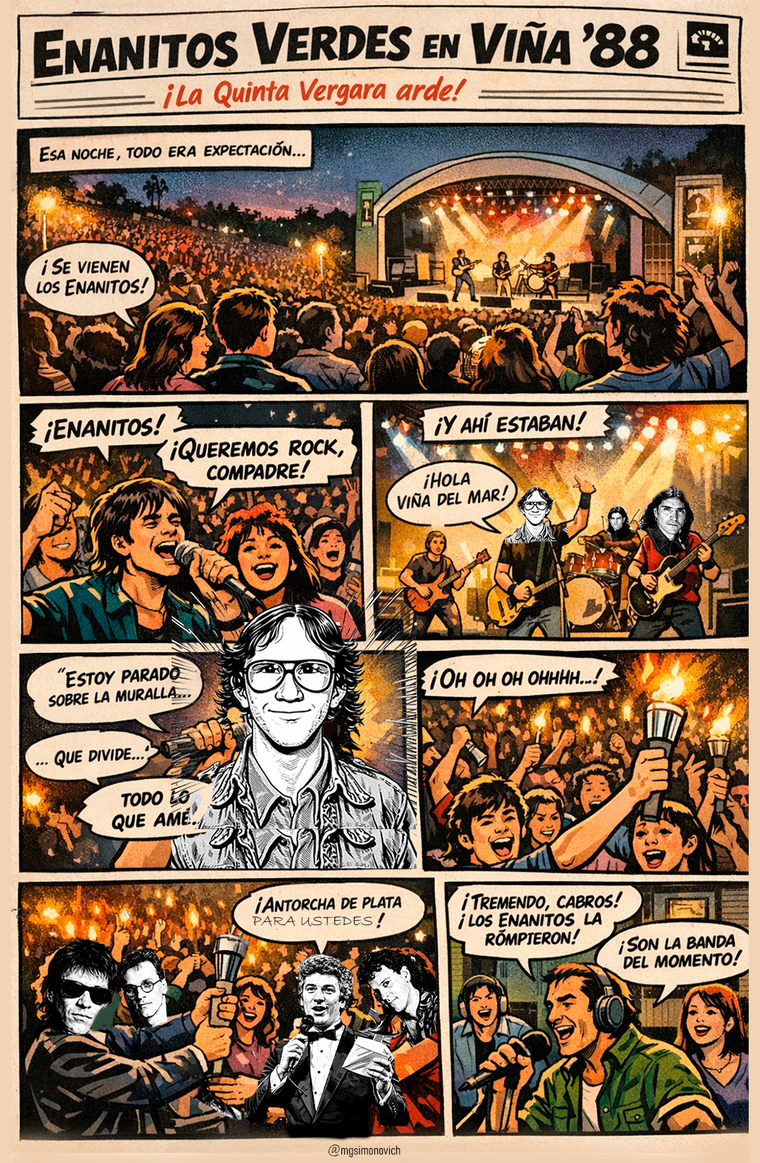El 17 de febrero de 1988, Enanitos Verdes subieron por primera vez a la Quinta Vergara y cambiaron su historia. En una noche eléctrica, el público del Festival de Viña del Mar 1988 respondió con una ovación inesperada, marcando el inicio de su consagración como referentes del rock un latinoamericano en plena expansión.