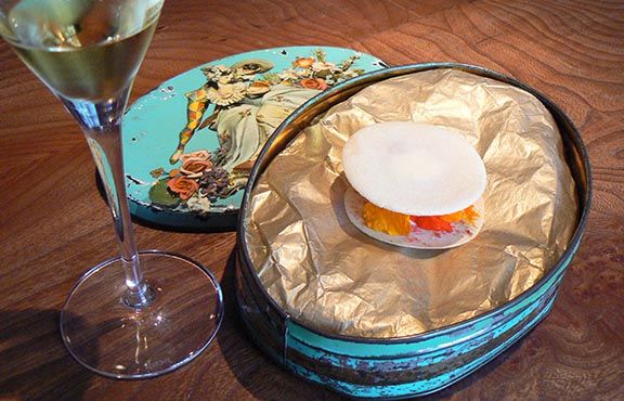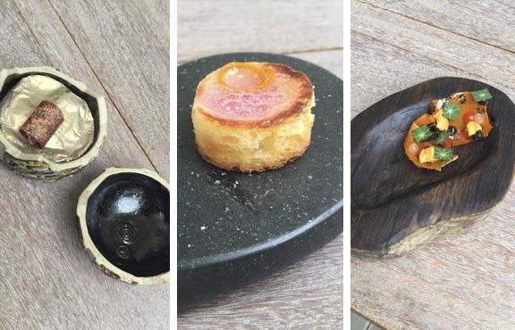 1. Caco, anchovetas y mascarpone, presentados en una caja artística llamada "Caja de Sueños". 2. Brioche de queso de cabra, aceitunas y ají amarillo. 3. Hojas de arroz crocantes.