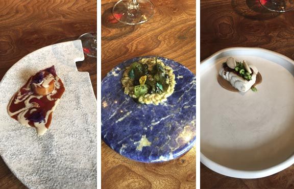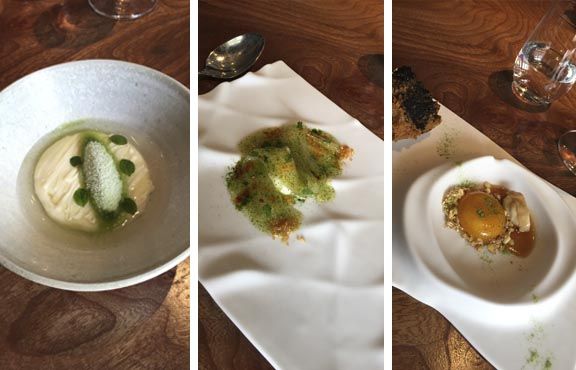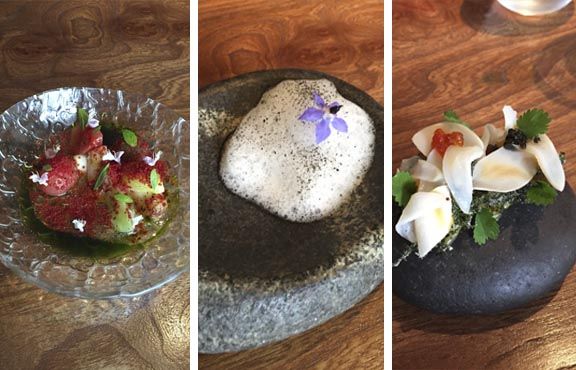 1. Tomates de Pachacamac. 2. Calamar con espuma de chupín. 3. Flores pimpinela, alga marina, tempura, crema de durazno, y caviar de esturión.