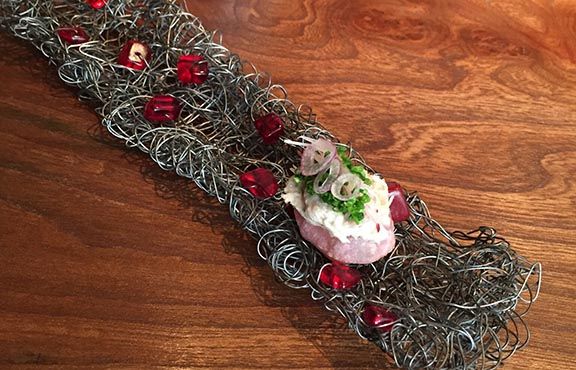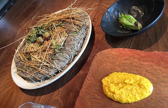 Papas nativas presentadas en un "nido" de barro y paja, con vegetales y una salsa Huancaína (con ají amarillo).