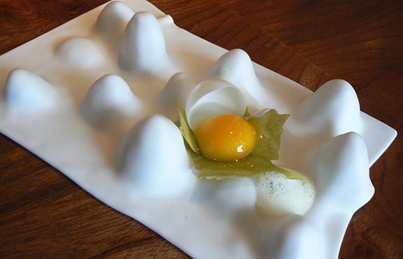 1. Sopa verde con hierbabuena, con 2 temperaturas diferentes, la parte verde fría, y la parte blanca caliente. 2. Falsa pasta con alioli. 3. Pollo, huevo y pan.