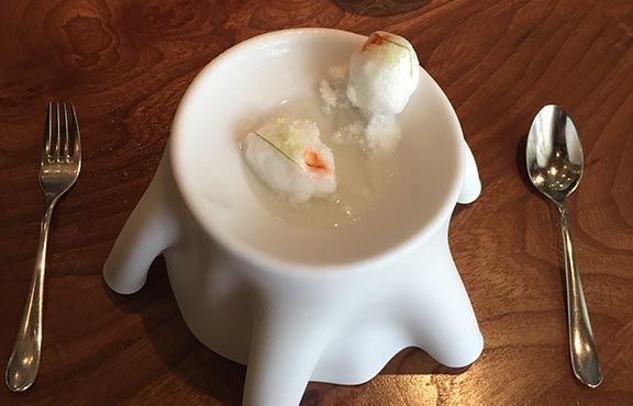 Luego de degustar los pasos iniciales del menú, nos invitaron a pasar al salón. Sorbete de limón, jugo de uva y pisco pulverizado en el momento.