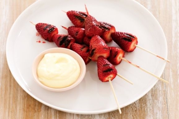 Si aprovechamos las frutillas (están hermosas en primavera-verano) podemos lograr un gran postre cocinándolas en palitos de brochette a la parrilla acompañandola con una ganache de chocolate blanco (crema de leche y chocolate blanco fundido en iguales proporciones)