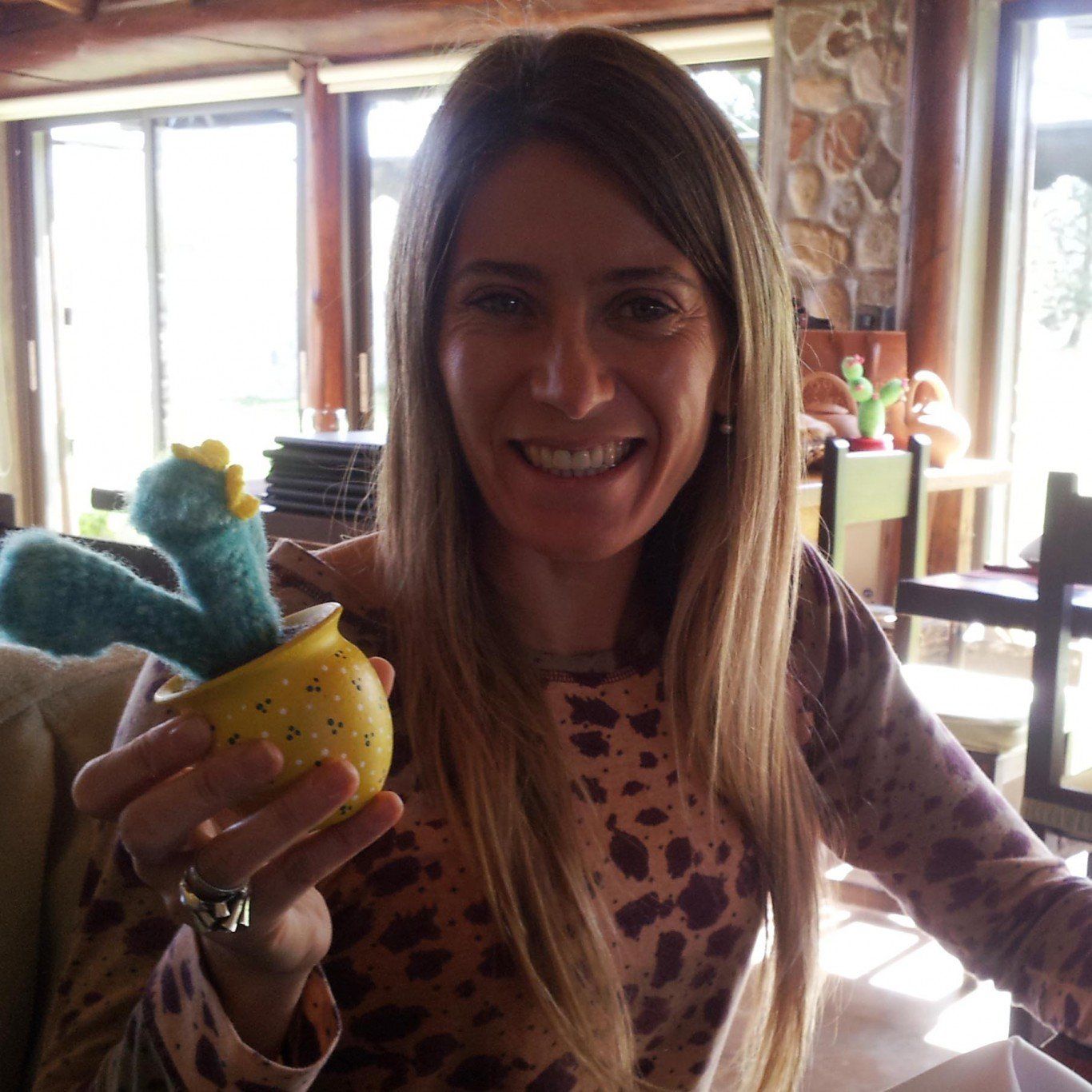 El lugar es muy agradable, cuidado en todos los detalles, impecable. Con un estilo rústico, paredes de piedra, pisos de cemento llaneado con detalles en madera, y muchos ventanales. La mesa muy sencilla con cubiertos Tramontina y vajilla simple, y las sillas estilo campo con almohadones. Muy simpáticos los cactus naturales y tejidos como centro de mesa... ¡quería uno! (pero no los vendían) La música suave y la temperatura ideal. No hacía frío ese día, pero vi una moderna estufa tipo salamandra con tiro balanceado que seguramente proporciona la tibieza necesaria en invierno y no te llenás de olor a humo.