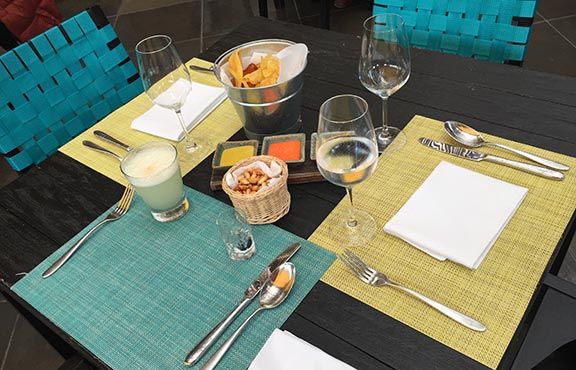 barra infinita donde muchos eligen almorzar. Individuales de colores, copas de cristal y una regia cubertería visten las