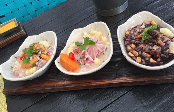 de cebiches: uno de erizos, otro de cabrilla (pescado similar al mero) y otro