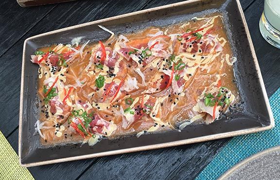 con mariscos o ravioles de cangrejo $180. Pisco sour $90. Tiradito de atún