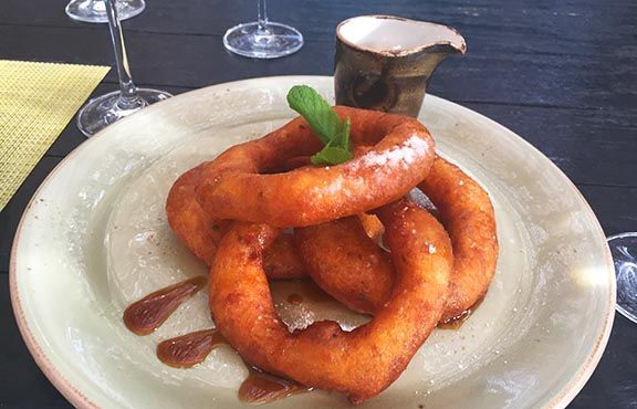 Y no podían faltar unos “picarones”. Son como nuestras “sopaipillas” o tortas fritas, pero la masa está hecha de camote y zapallo. Arriba están salseados con una miel de hoja de higo y especias.