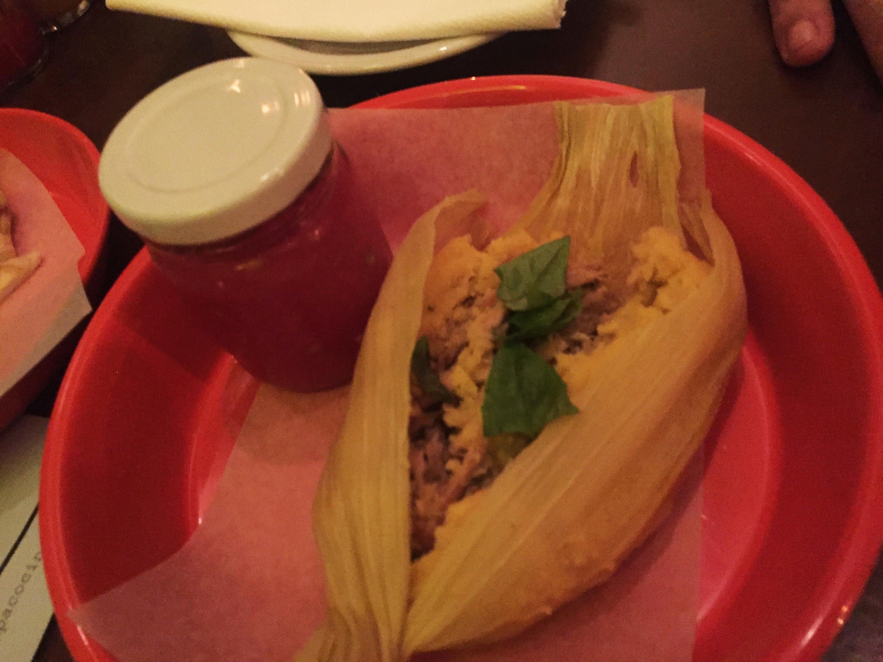 tomás un trago en la barra, con una opción alcanza. Tamal de cerdo con salsa llajwa (de tomates frescos y ají).