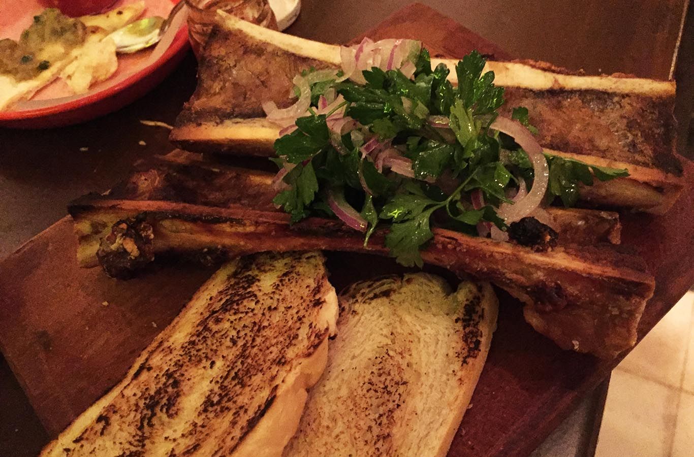 picante, y un kétchup casero. Hueso de caracú al horno con tostadas, y una ensalada de perejil y cebolla.
