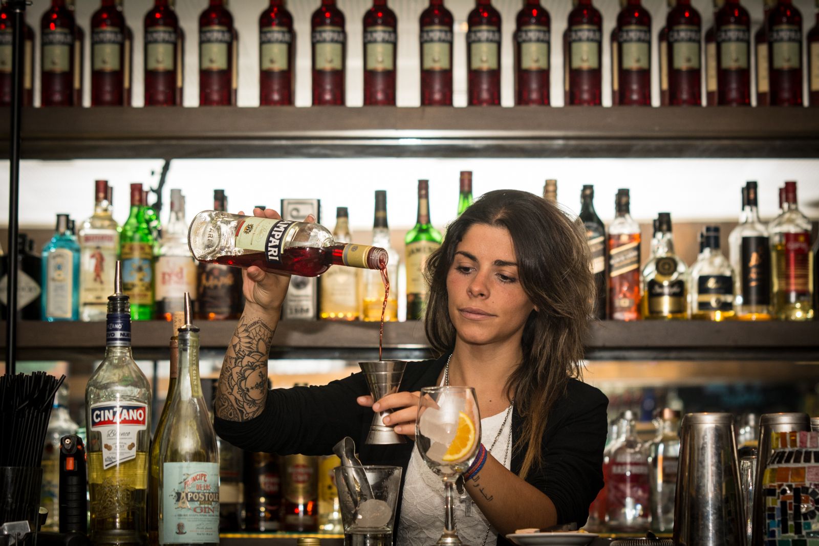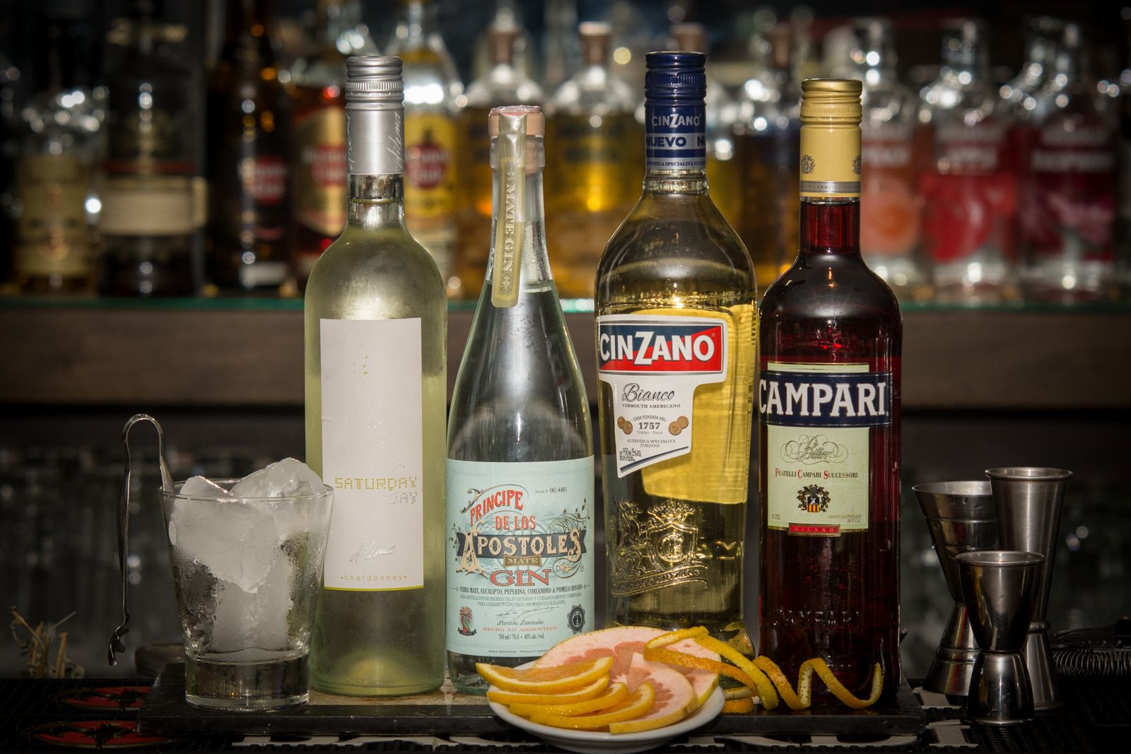 2 oz de Campari- 2 oz de Cinzano Bianco- 1 oz de Gin Principe de los Apostoles- 0.5 de Vino Chardonnay
