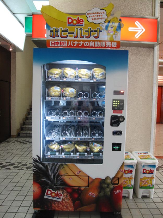 Sí, sí, de plátanos. No sabemos porqué esta fruta y no otra, como manzanas, tal vez sea porque tardan más en echarse a perder Sea como sea, en Japón existe la posibilidad de encontrar esta fruta a cualquier hora del día. No dejes de buscar en los tachitos de residuos junto a la máquina para depositar las cáscaras de plátano, el nivel de civismo en Oriente es bastante superior al nuestro.