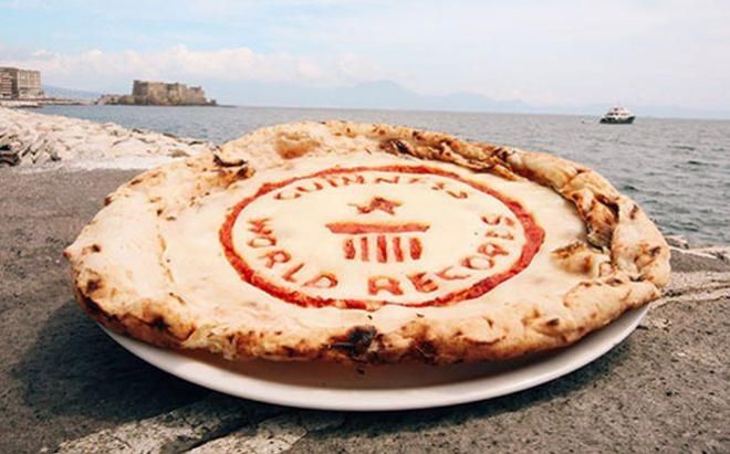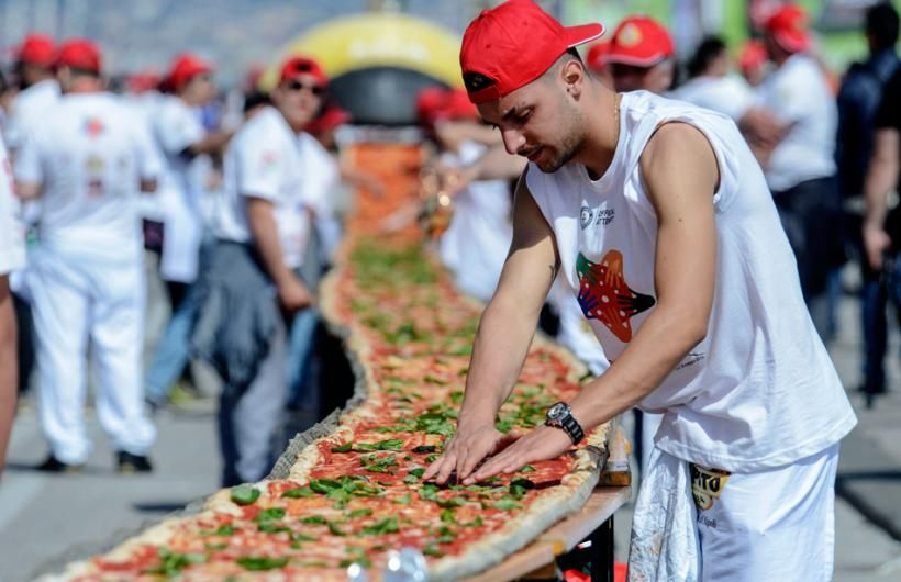 Esta deliciosa pizza "Margarita" (con tomate, queso y albahaca), de mil ochocientos cincuenta y tres metros de largo, fue horneada en Nápoles por laAsociación de Pizzeros Napolitana, con el objetivo de establecer un nuevo récord Guinness. El año pasado habían logrado hacerla 200 metros más corta.