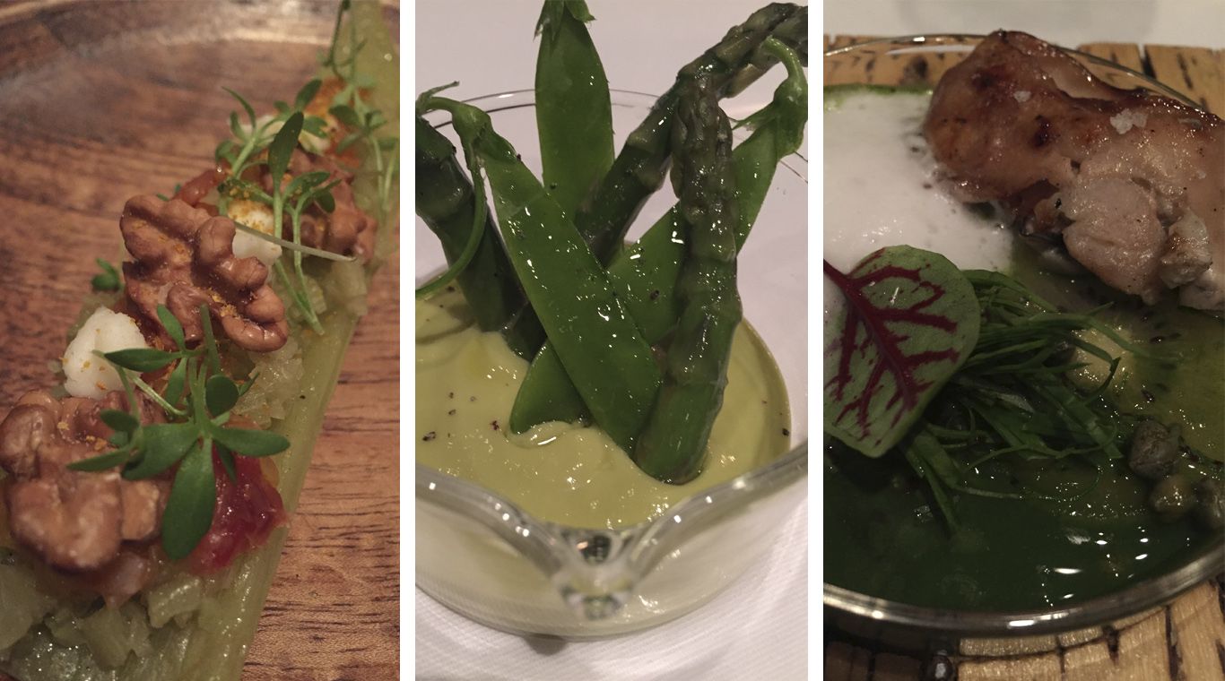 Continuamos con el primer plato excelente de la noche: tirabeques y puntas de espárragos. Perfecto el fondo, equilibrado en sabor y en ácidos con umami destacable. Sobresaliente paso. Y muy bonito de ver.