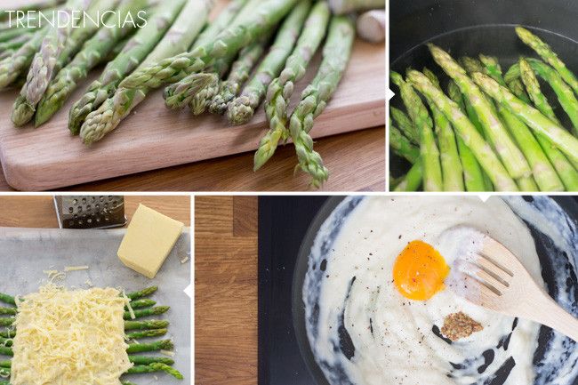 En ese momento, se añade la yema de huevo, la mitad del queso rallado y el jamón y se mezcla todo muy bien con una cuchara de madera. Se vuelca esta salsa sobre los espárragos. Lo ideal es cubrir todos los espárragos, excepto las puntas, así se lucen y el plato se ve más tentador.