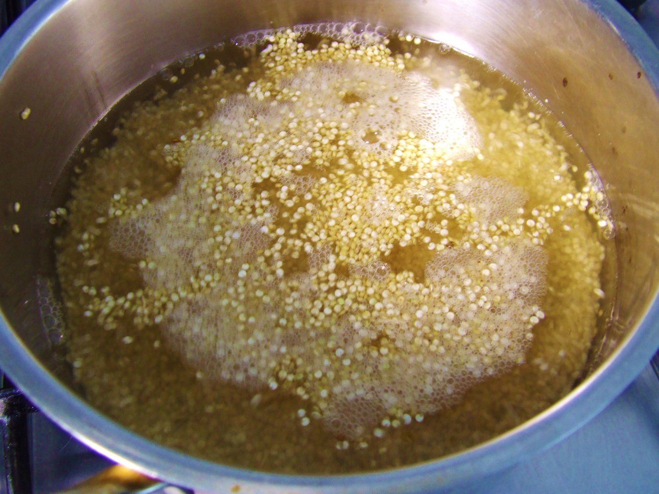 Una vez que s eleva la quinoa, se cuela muy bien y se coloca en una olla con 1 parte de quinoa por tres partes de agua hirviendo y sal a gusto. Es decir que si vas a cocinar una taza de quinoa, necesitarás agregarla a una olla que contenga tres tazas de agua hirviendo y sal.