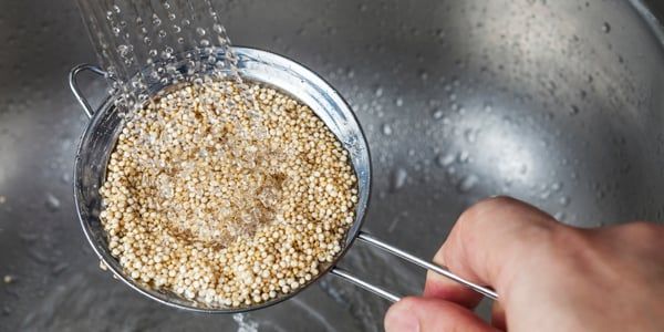 Es fundamental lavar la quinoa antes de cocinarla para eliminar la saponina que contiene (si no retiramos el exceso de saponina lo más probable es que el cocinarla resulte un poco amarga... ¡y no queremos nada de eso para nuestra receta!), para ello se enjuaga unos segundos bajo el chorro de agua fría, veremos que hace espuma. No se debe dejar en remojo más de unos minutos pues lasaponina se despositaría en su superficie y no lograríamos eliminarla.