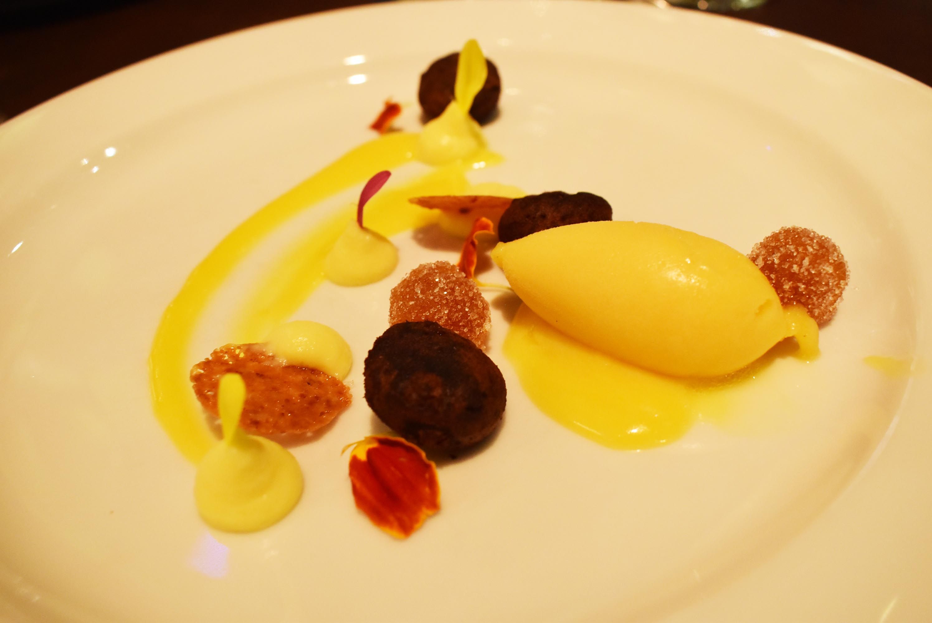 Y para terminar, beignet (buñuelo) de chocolate, cremoso de mango, bombón de frutas, curd y sorbet de maracuyá de Formosa, y crocante de azafrán.