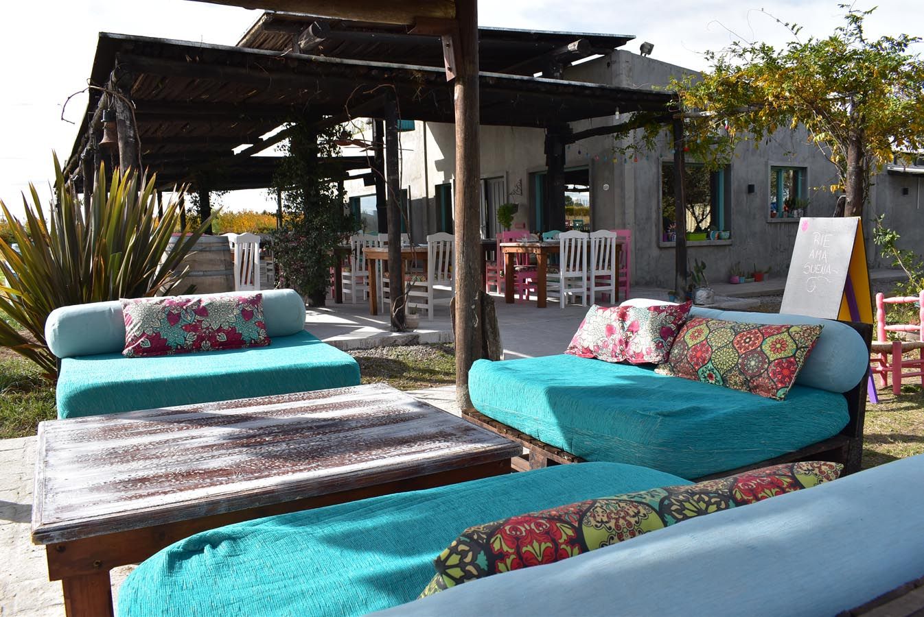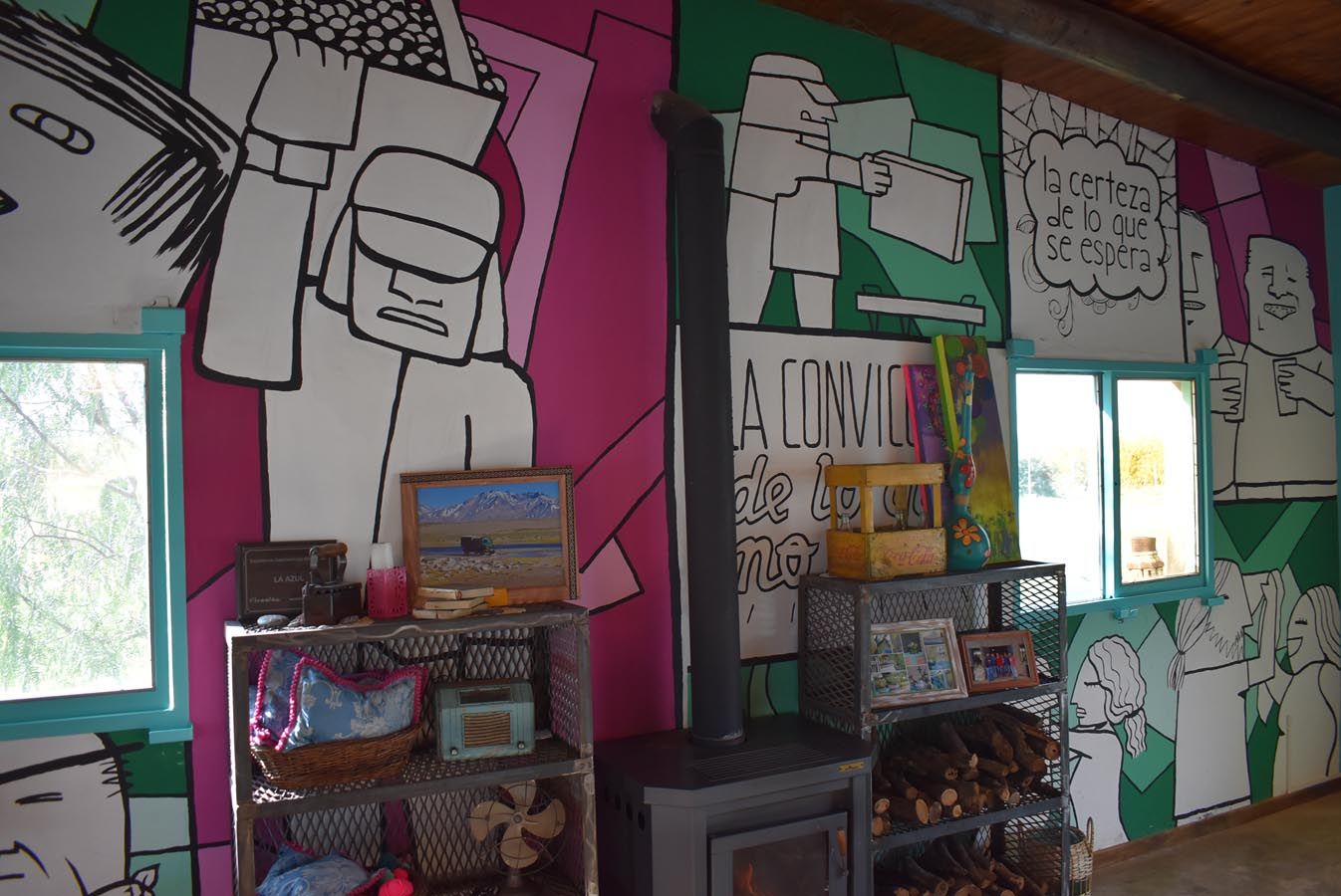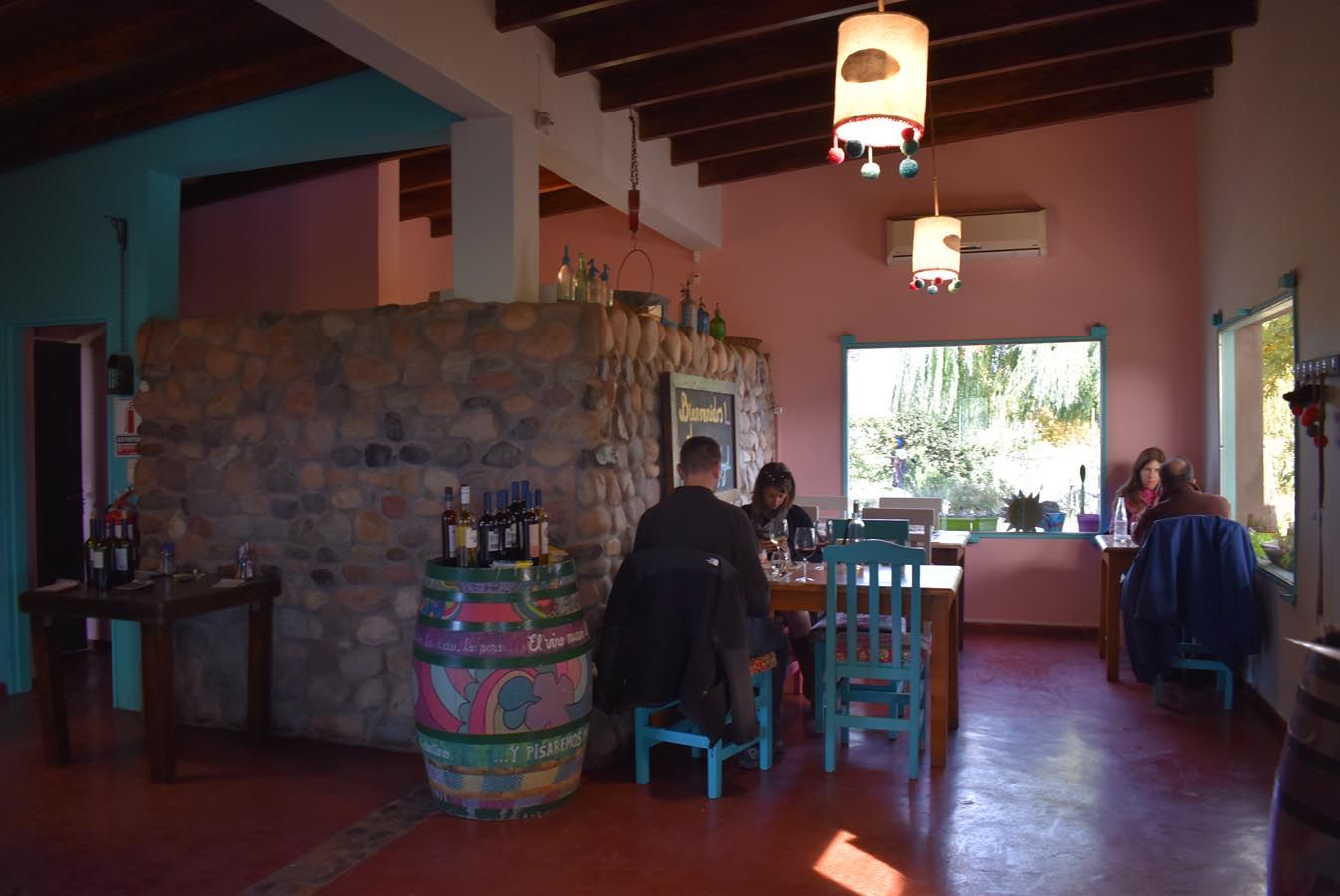 El ambiente es simple, similar a un puesto de campo, colorido, lleno de mensajes positivos, murales y barricas pintadas con leyendas y dibujos alusivos al vino. Se puede comer adentro, o en la pérgola exterior con una vista preciosa al Cordón del Plata. Recientemente el espacio ha sido renovado, y justo lo visité en su primer día de reapertura, por lo que todo estaba "reluciente".