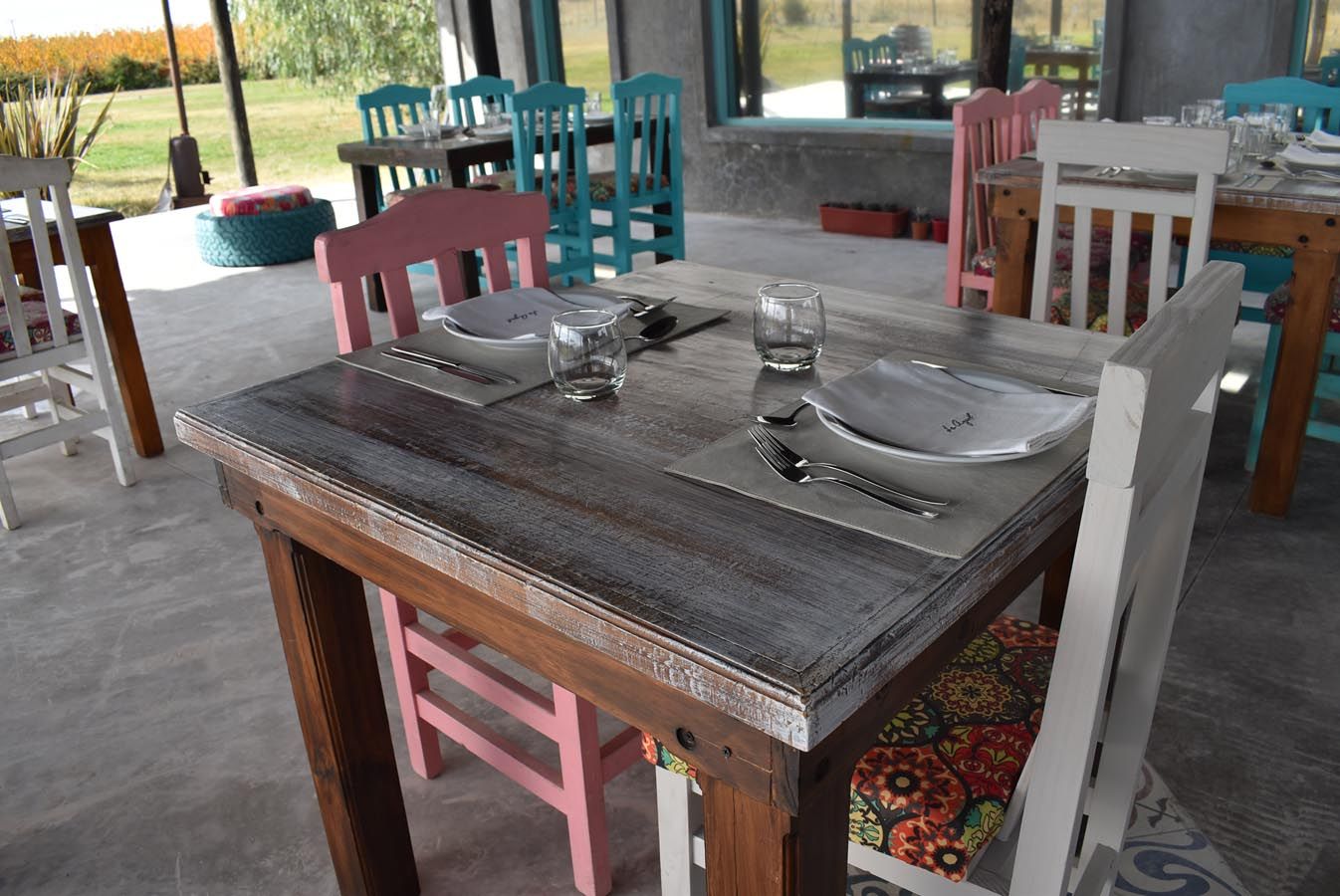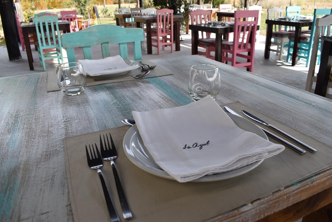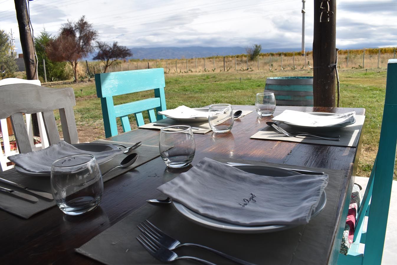 Servilletas de lino bordadas con el logo de la bodega, copas de cristal, y una vajilla pintoresca nos dan la pauta que allí cuidan los detalles, a pesar de la rusticidad del lugar.