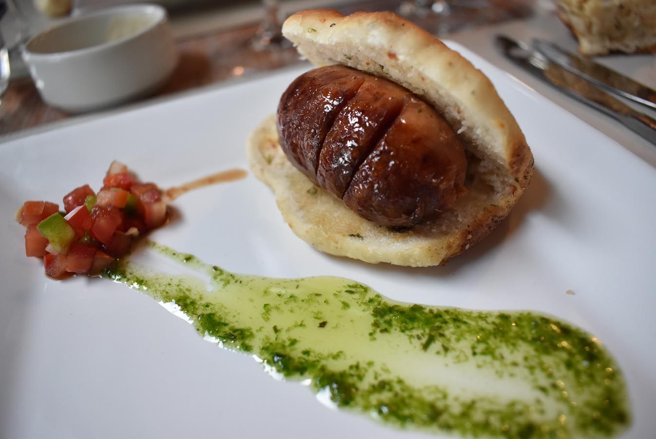 El tercer paso, un choripán dulzón, cocido con vino blanco, puro cerdo (y quizás algo de jabalí?), en un pan similar al brioche, con una salsita de tomate, pimiento y cebolla. Para el recuerdo, inigualable.