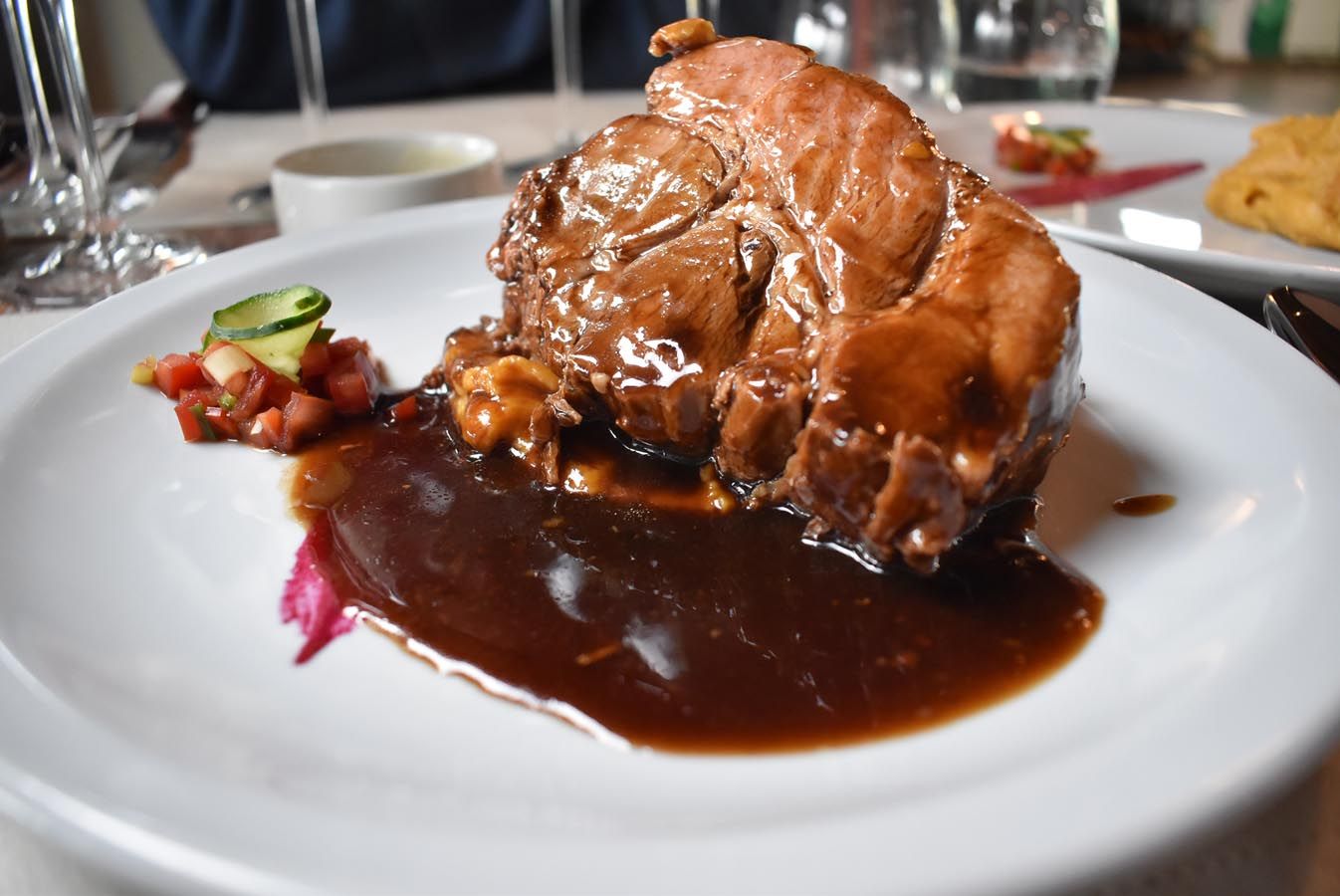 El cuarto paso y principal, a elección. Varían los platos según el día. A veces es pasta, a veces carnes. En esta oportunidad pedimos bondiola braseada, con puré de batatas. El plato llegó un poco frío, pero lo calentaron apenas lo solicitamos.