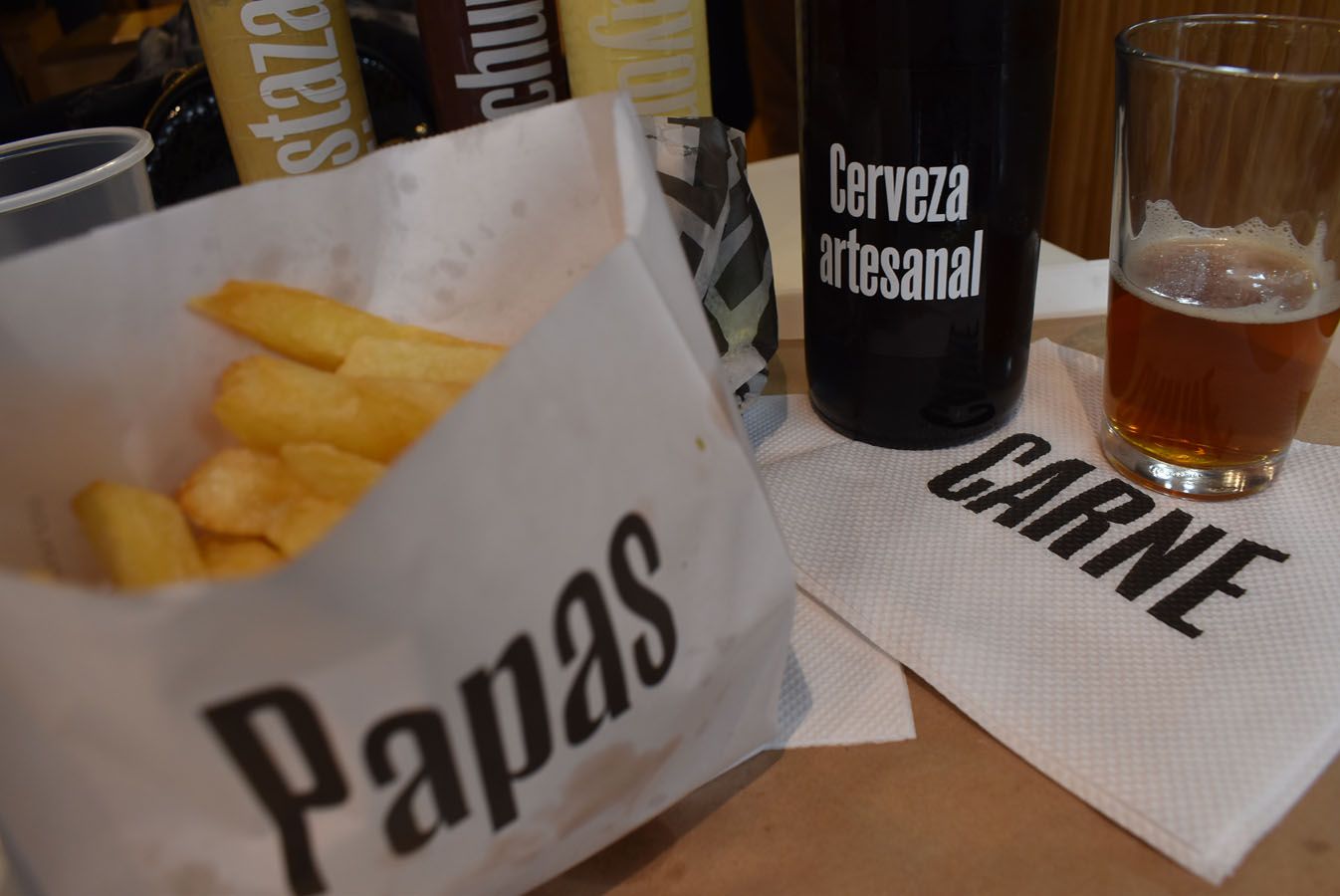 Una hamburguesa CARNE, la más completa de todas. La hamburguesa en sí está hecha de carne de pastura, madurada, y apenas tiene sal. Además lechuga y tomate orgánicos, cebolla colorada, pepinillos, queso artesanal y huevo de granja. Unas papas fritas de lujo, y una bebida (yo probé la cerveza artesanal). Si querés vino, ofrecen el Tintillo de Santa Julia.