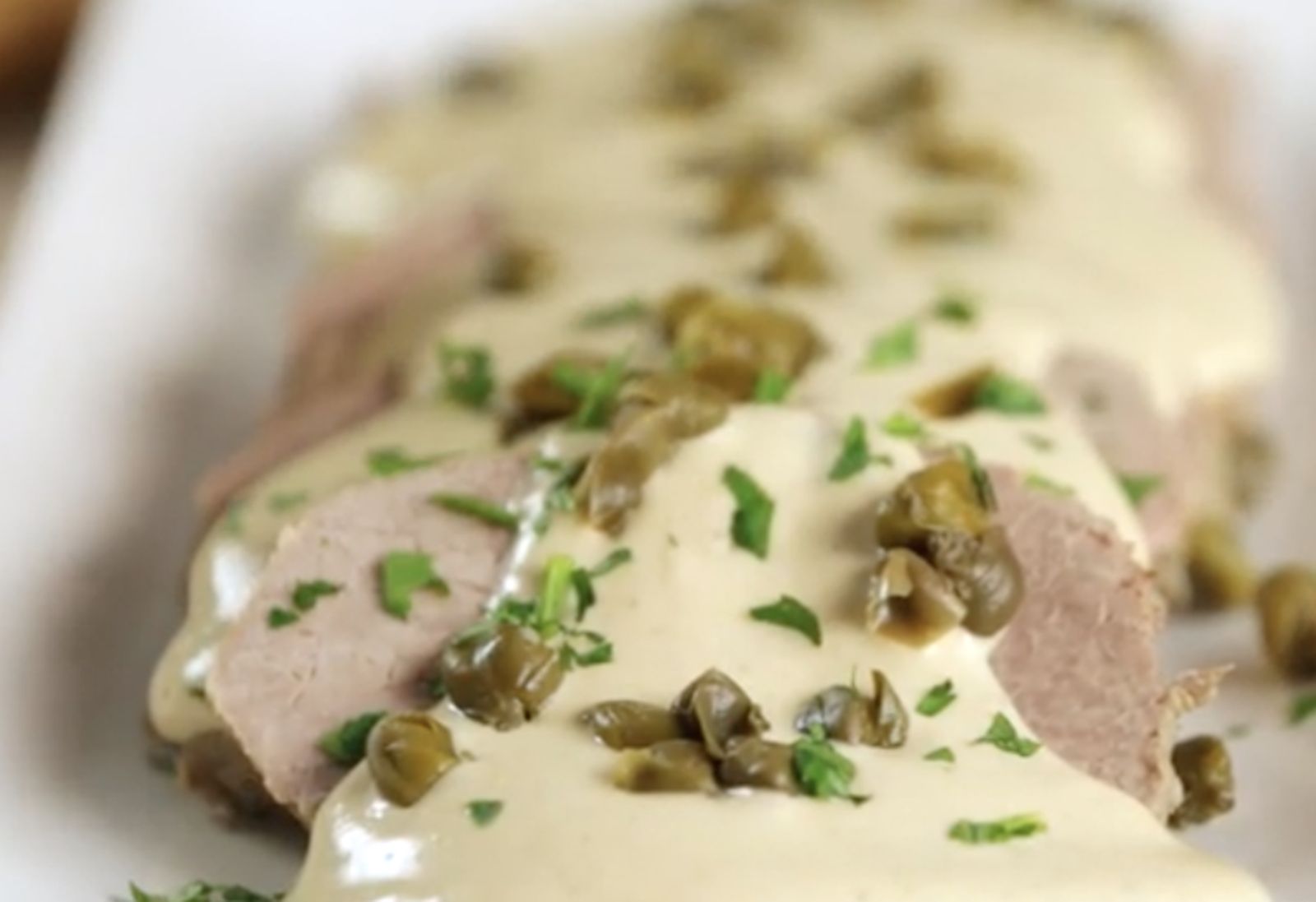 Lleva peceto, y una salsa de atún con huevo, anchoas y mayonesa. Se sirve frío como entrada.