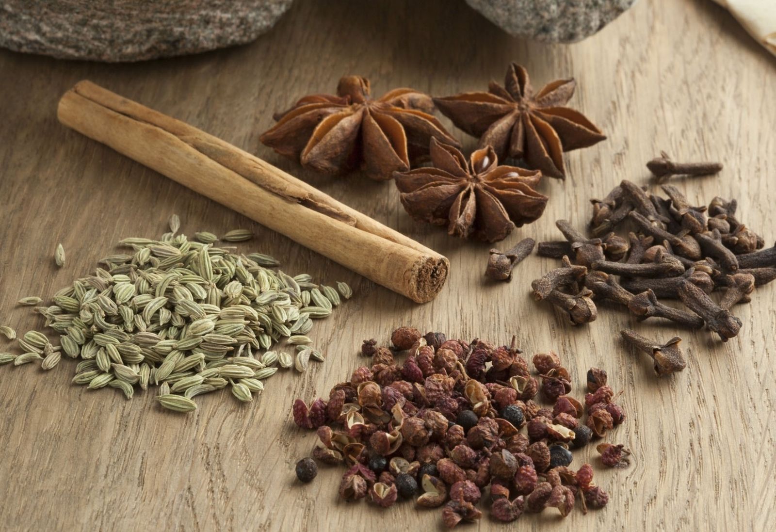 Tuesta todas las especias, excepto la canela, en una sartén sin nada de grasa hasta que comiences a sentir sus olores y sus aromas. Aparta de la hornalla y deja enfriar. Una vez frío, coloca todas las especias, incluyendo ahora la canela, en un molinillo eléctrico para café o en un mortero, y tritura hasta que obtengas un polvo bien fino. Obtendrás un polvo marrón-ámbar, donde, el sabor y el aroma del anís estrellado, dominará.