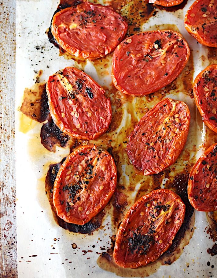 - Calentar el horno a 425°F / 220°C. Tomar un recipiente y mezclar las especias, colocar los tomates cortados hacia arriba sobre una bandeja con papel aluminio, rociar los tomates con la mezcla de especias y aceite de oliva.