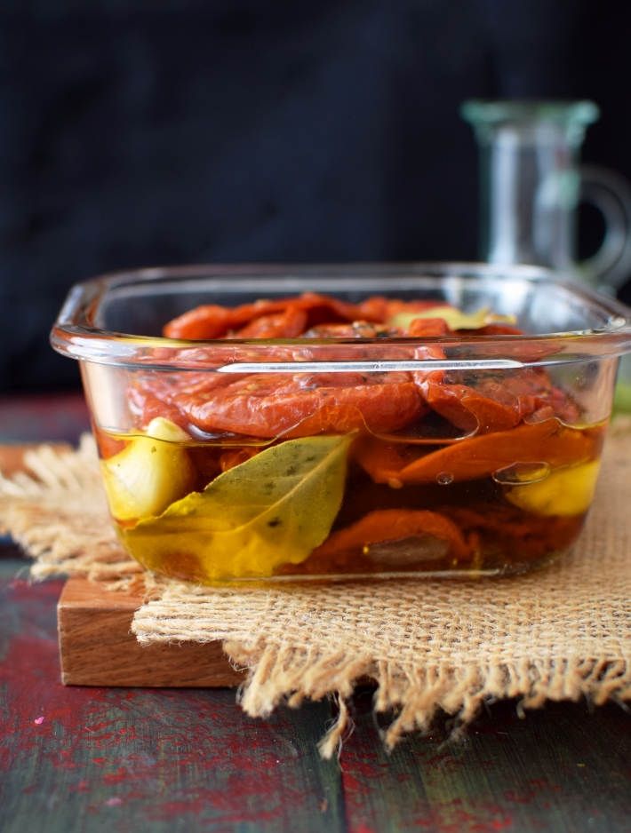 - Horneamos los tomates por 15 minutos, apagamos el horno y los dejamos secar por una hora. Le quitamos el exceso de líquido y volvemos a hornear por 15 minutos, en caso que falte deshidratar repetimos el proceso. Luego tomamos un recipiente hermético y le colocamos aceite de oliva ¡ahora los podemos conservar y disfrutar en otras recetas!