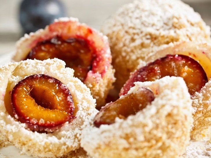 Svestkove knedliky, normalmente las relacionan con las empanadillas saladas pero se comen como un postre. Tienen por dentro una fruta, que tradicionalmente puede ser una ciruela con masa alrededor. Se fríen y se impregnan con mantequilla y azúcar.