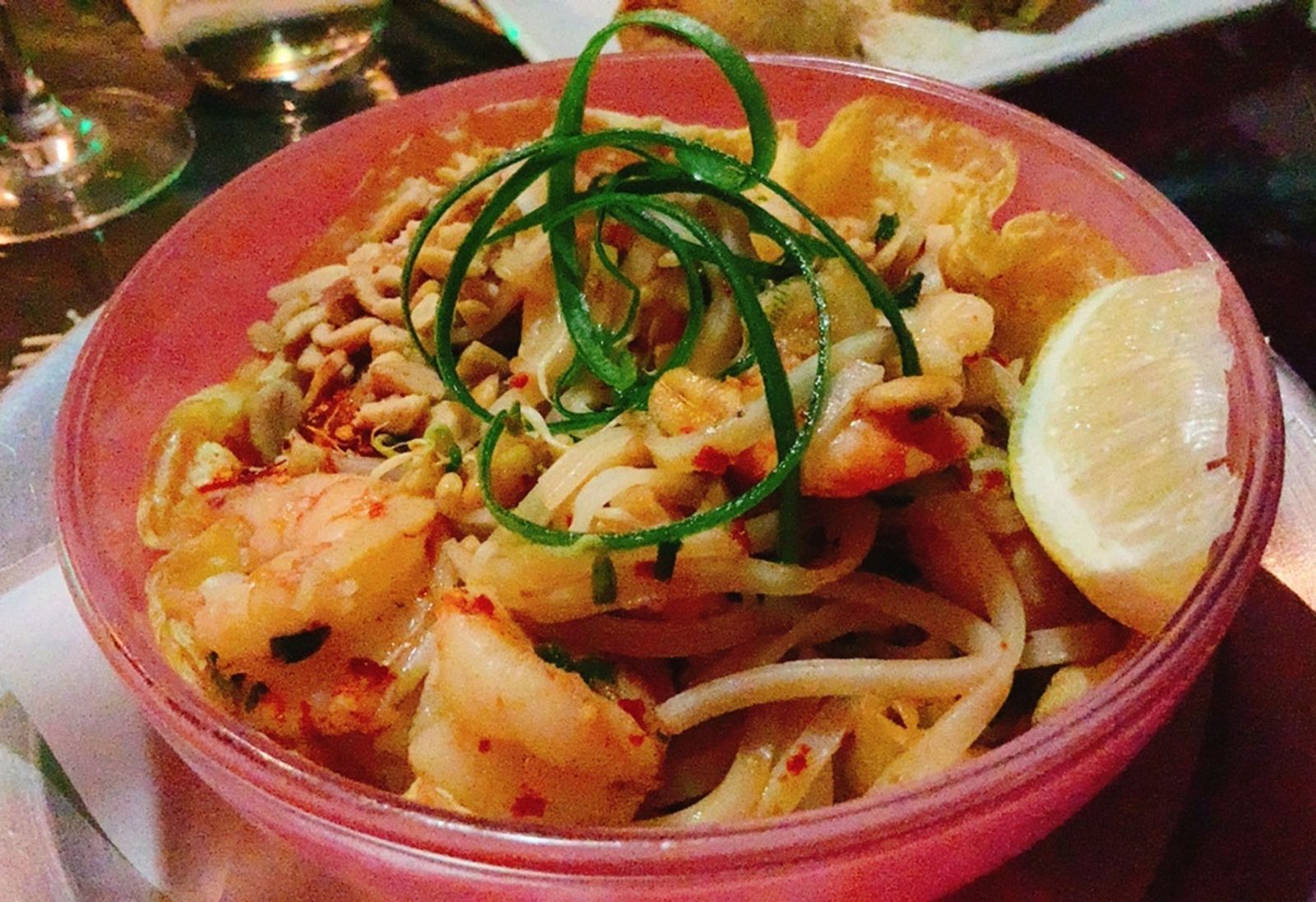 Como platos principales, pedimos un Pad Thai ($635*), un salteado al wok tailandés con fideos de arroz gruesos (como tallarines). En este caso con langostinos salteados, aunque había con pollo también. Lleva salsa de tamarindo, maní, brotes de soja, ajo y cebollita de verdeo. Una delicia, una bomba de sabor.