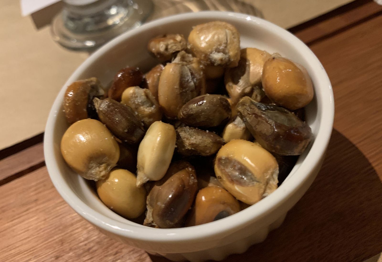 Apenas llegamos nos acercaron una botellita de alcohol a.la mesa, en cuya etiqueta estaba impreso el QR para escanear y tener acceso a la carta en nuestros celulares. Nos trajeron un dip con maíz cancha, riquísimo, como para abrir el apetito. También trajeron unas rodajitas de pan (cuatro) con unos dips de mayonesa y una salsita picante.