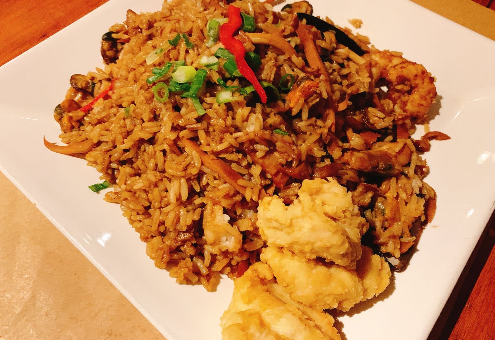 El otro principal fue un Arroz Chaufa de mariscos ($815*). Se trata de un arroz salteado, con salsa de soja, pimienta, jengibre, cebolla de verdeo y huevo, con un mix abundante de mariscos. El arroz en mi opinión estaba un poco pastoso, pasado, le faltaba algo de soltura para ser un salteado. Los trozos de pescado rebozado y frito estaban como deben estar: crocantes y sabrosos.
