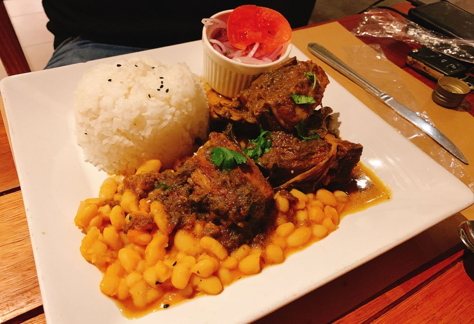 Uno de los principales fue una Seco de Cordero ($529*), un guiso de carne con arroz blanco, porotos y ensalada de cebolla. Al ser un guisado la carne estaba muy tierna, para comer con un tenedor solamente. La salsa con los jugos de cocción estaba exquisita, pero un poco escasa. En estos casos es conveniente un poquito más de salsa para poder mezclar con el arroz blanco seco.
