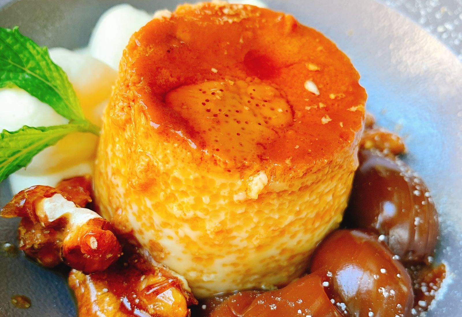 Flan de huevo con mucho dulce de leche (por suerte para mí que soy una fanática). También acompañaban unas nueces garrapiñadas. Gigante, exquisito, textura suave. Para hacer felices a muchos.