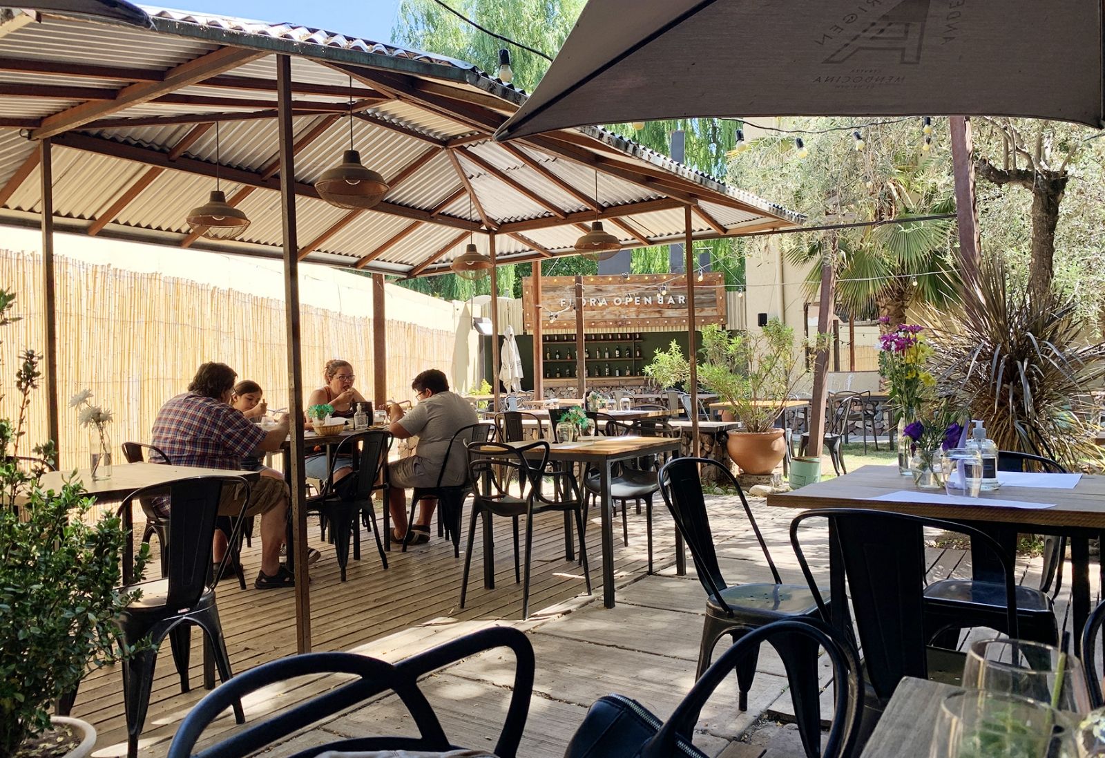 Entrás por una escalerita entre árboles y plantas. Tiene un gran salón de doble altura, rústico, con decoración ecléctica y cálida. Pero lo más lindo está en el jardín. Es amplio, con sombrillas y toldos, y rodeado de verde. Allí se puede comer tranquilamente, y soportar las altas temperaturas de estos días de verano.