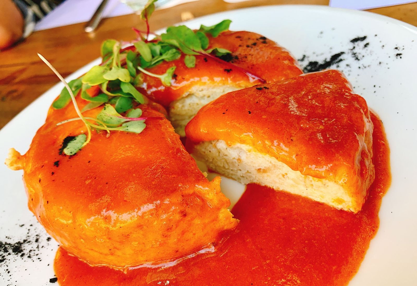 Visitamos Flora un domingo al mediodía en diciembre. ¡Mucho calor! Mientras esperábamos, pedimos unas limonadas. Nos trajeron unos pancitos con oliva y sal, como pequeñas tortitas mendocinas (adictivos). Nos repusieron esa panera varias veces durante el almuerzo, fueron un éxito.
