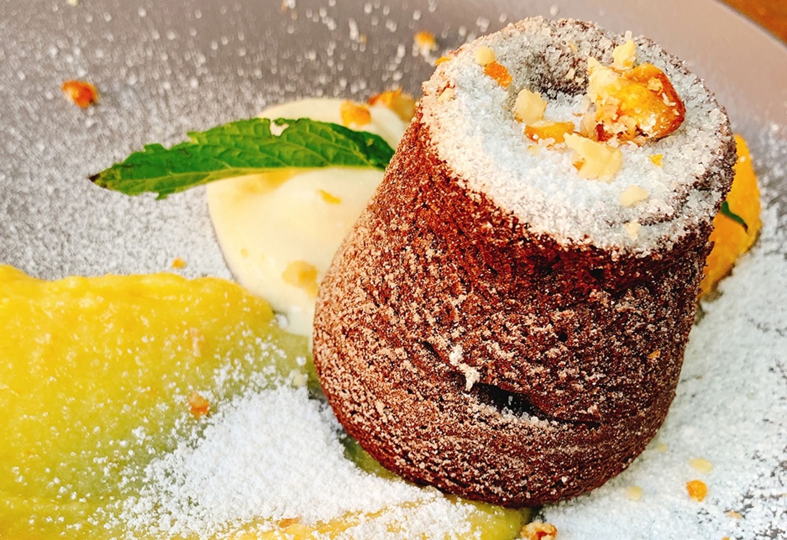 Volcán de chocolate. El centro no estaba líquido, pero su sabor impecable. Muy buena calidad de chocolate, y una agradable textura del bizcocho. Venía acompañando una crema chantilly, y una de naranjas.