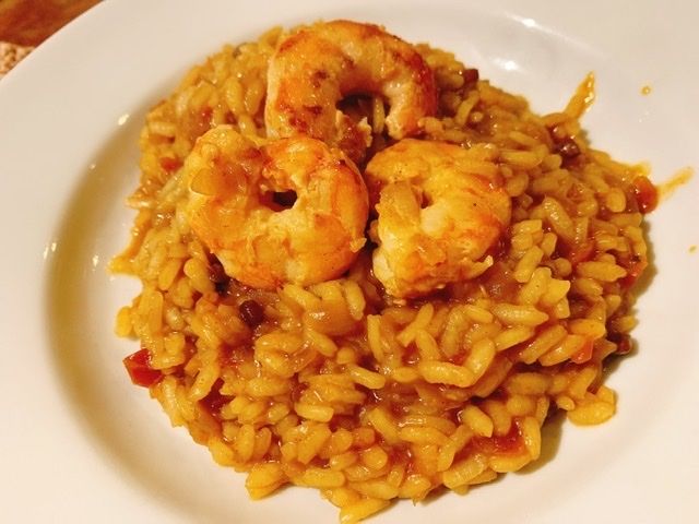 El plato principal es un arroz con langostinos. Por un lado hay que calentar el caldo, y mezclarlo en una sartén con un sofrito y el arroz (todo viene por separado, rotulado, y envasado al vacío). Y por último agregar los langostinos sellados previamente. Muy fácil de preparar y rápido.