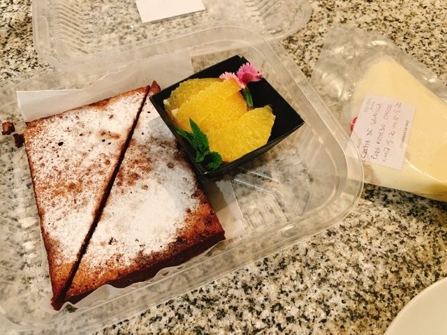 El poste es un “´húmedo” de chocolate, con crema de vainilla y gajos de naranja .