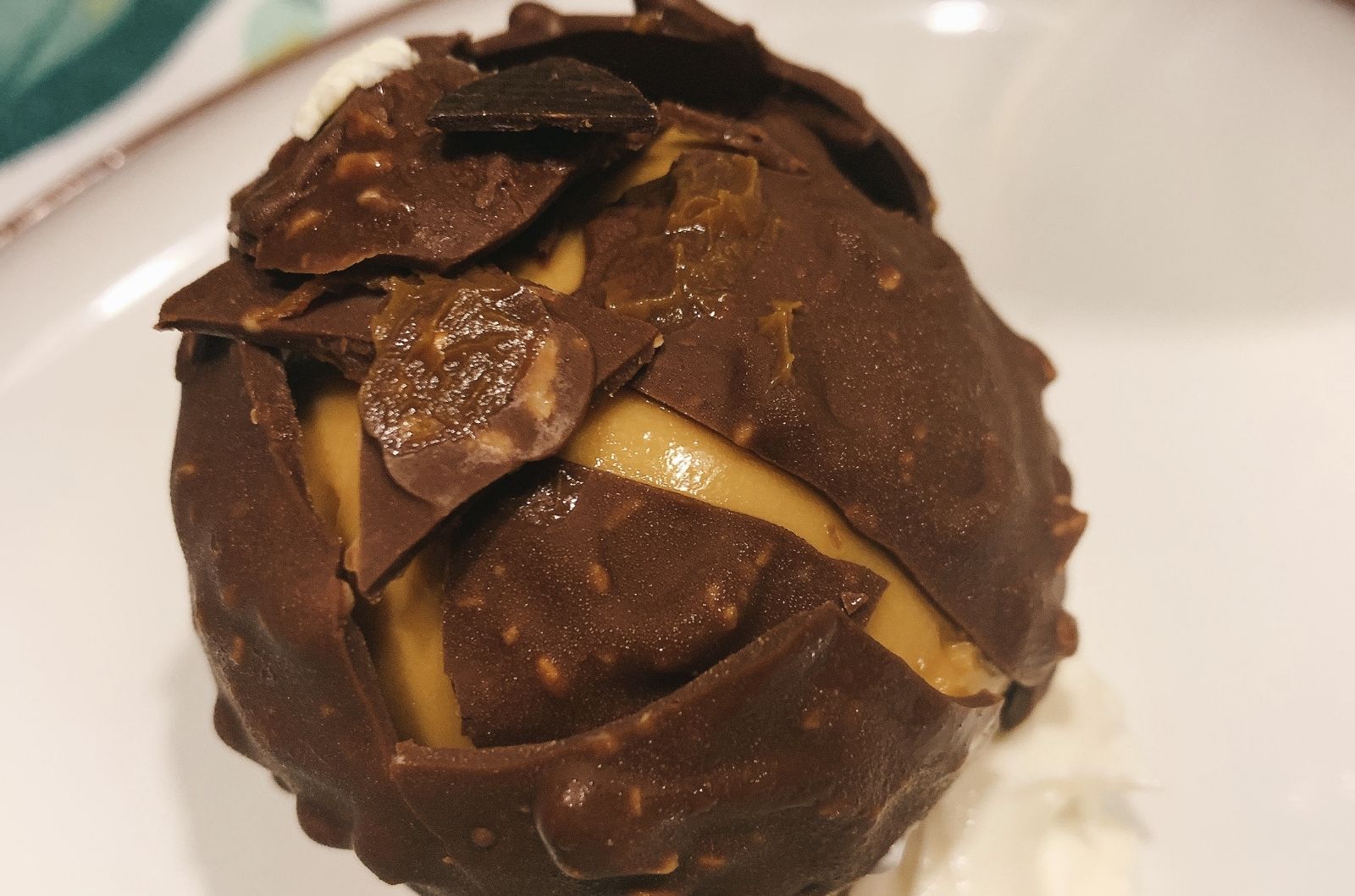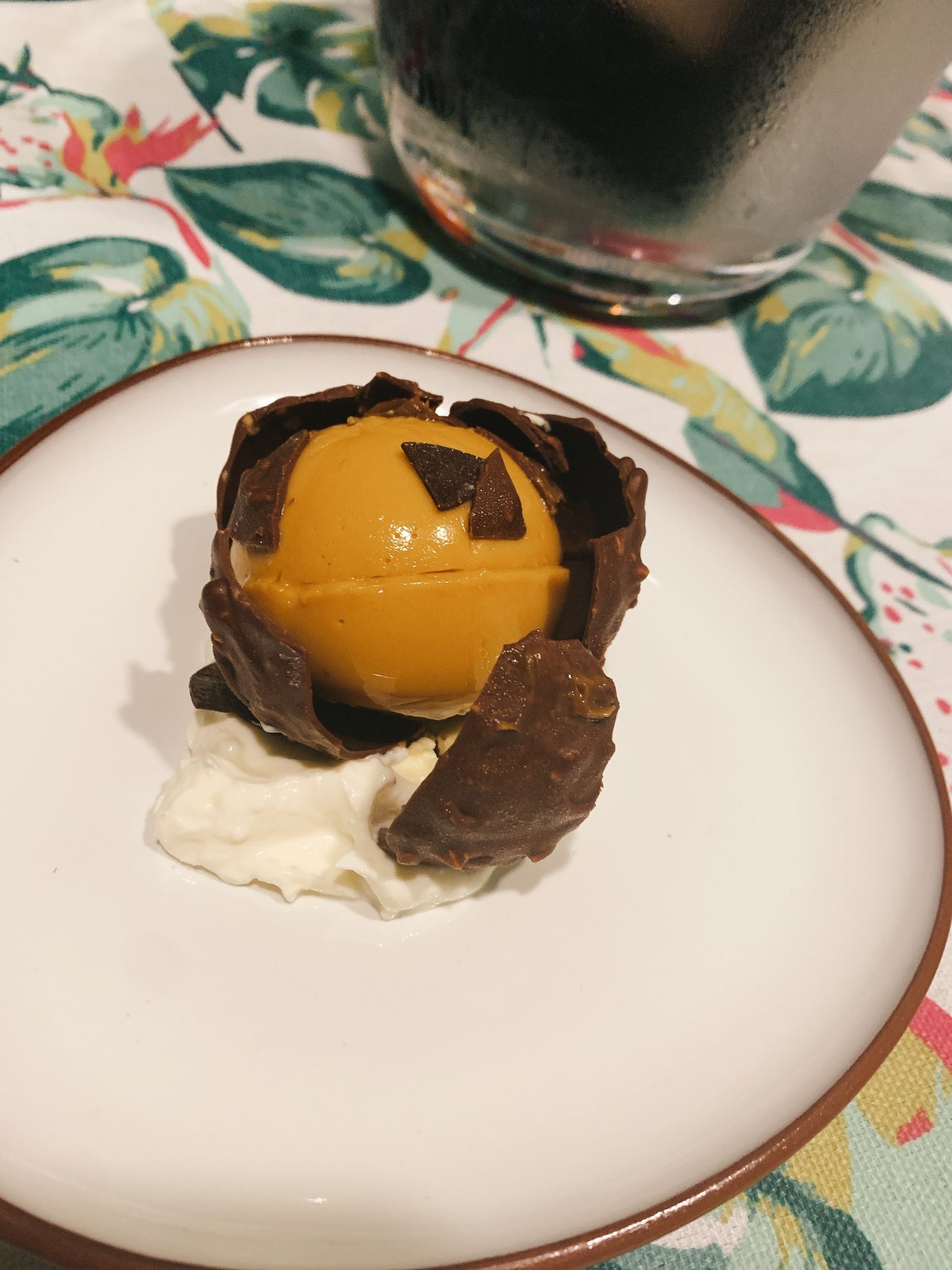 Para ir terminando, serví la parte más dulce del menú nuevamente con el espumoso. Una bolita de chocolate, con una mousse de dulce de leche por dentro, con avellanas.