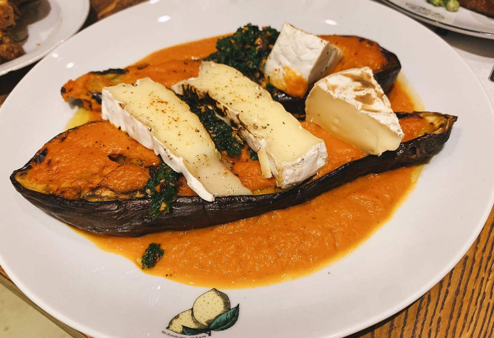 Una de las entradas, estaba compuesta por berenjenas con salsa pomodoro, queso Brie gratinado, y pesto de albahaca ($410*)